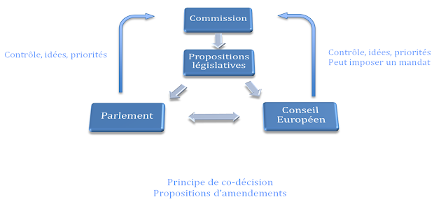La procédure législative repose sur le principe de co-décision entre le Parlement et le Conseil européen. Lorsque la Commission propose un texte, le Parlement et le Conseil discutent et votent en « 1ère lecture » afin de donner leurs avis sur la proposition. Si le vote est positif, le texte est adopté, sinon il retourne auprès de la Commission avec les propositions d’amendement des deux institutions. Le texte est révisé puis proposé à nouveau au vote.